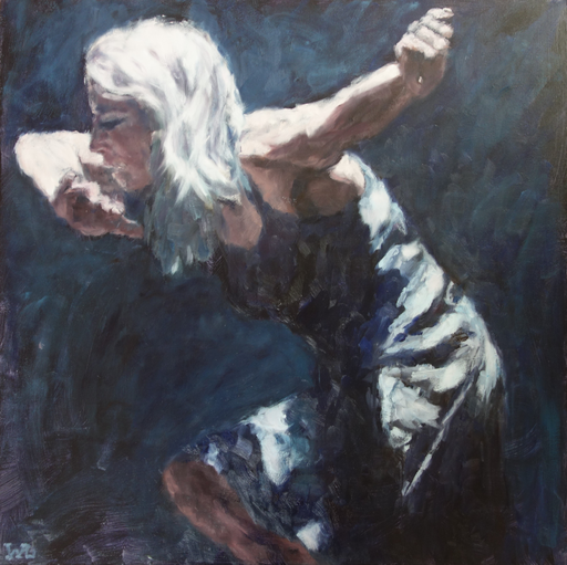 In het schilderen ben ik op zoek naar ruimte en beweging. Met vlugge dan weer trage verfstreken zet ik de verf op doek of paneel. Waar zit het licht, waar zit het donker? Vorm zoekend, gaande weg schilderend en gebruik makend van kleur vormt zich het schilderij. Ik schilder het liefst figuren in het moment.